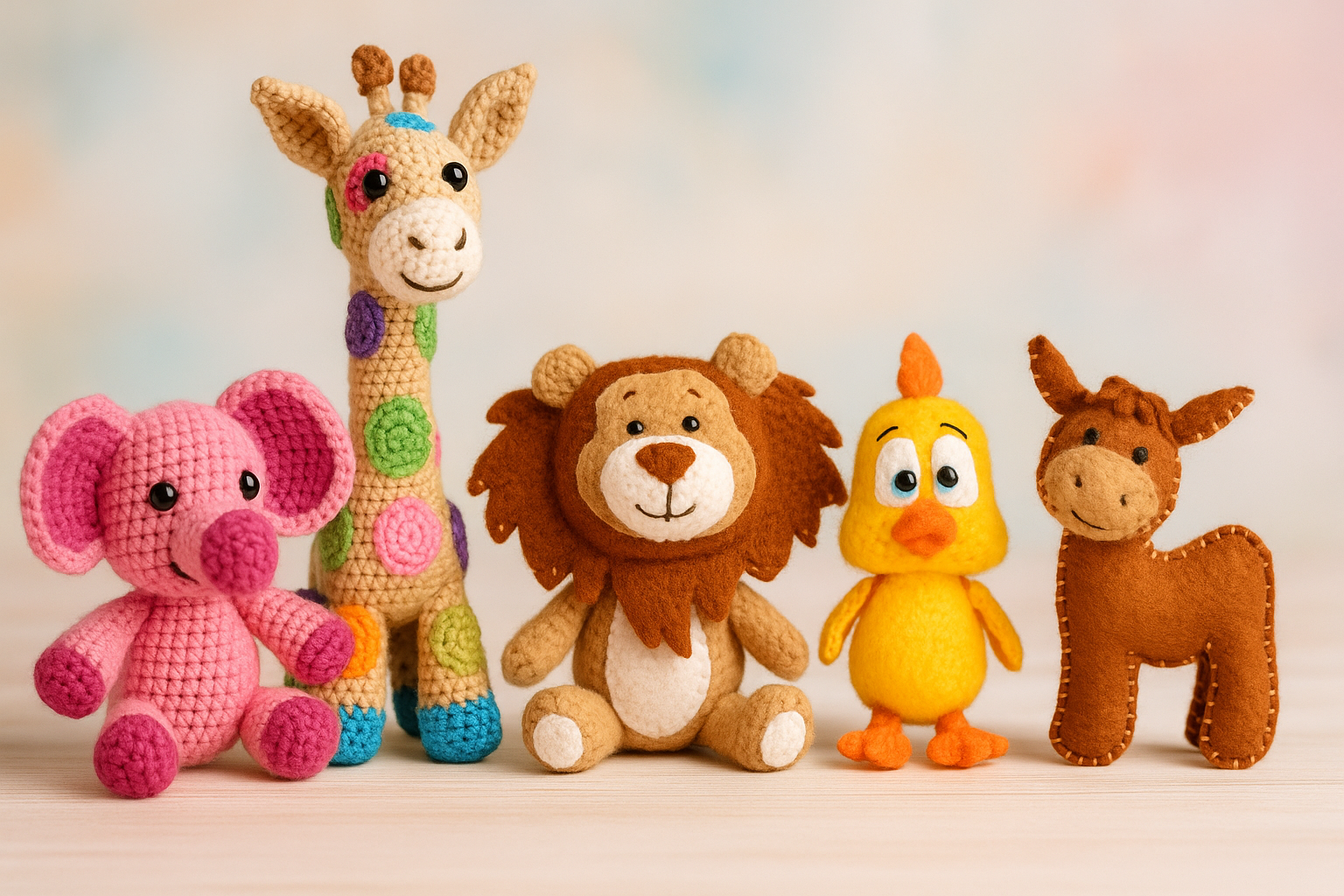 Pequeños y adorables muñequitos tejidos a mano con amor y dedicación. Cada animalito —elefante, león, pollito o vaquita— mide aproximadamente 10 cm de altura. Están confeccionados con hilos suaves de excelente calidad y rellenos con algodón siliconado antialérgico, lo que les da una textura ligera, esponjosa y duradera.